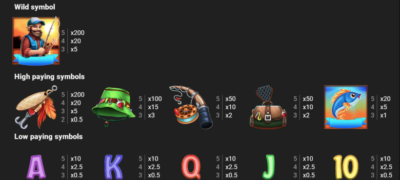 В Mega Fishing Mania используется классическая система символов: от стандартных карточных обозначений до тематических рыб, снастей и рыбака. Всего в игре 10 основных символов, включая 2 специальных — Wild и Scatter. Самый прибыльный символ — рыбак, который не только приносит крупные выплаты, но и активирует бонусные функции.